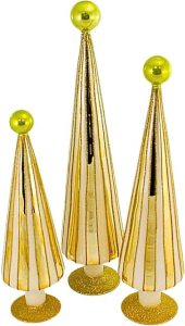 • Treat yourself or someone you love to this luminous trio of exquisite chartreuse green pleated glass trees adorned with aqua blue ball tops. By designer Cody Foster, these shimmering statement trees formed of shapely geometric art glass will shine brightly on the mantel, windowsills, dining table and beyond. And in this sophisticated color way, they will keep the enchantment of winter going long before and after the holidays are over! Heirloom worthy. Mix a dash of this designer hue into your holiday palette, and dazzle a friend, a hostess, business colleague or home curator with something they'll treasure for years to come. set of three trees in varying widths from 3” to 5” and heights measuring 10” to 16” tall Please allow 4-5 additional business days processing time for this item. Some